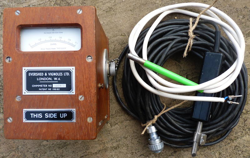 Bonding Tester Made by Evershed and Vignoles for the Royal Air force (part number 5G/6625-99-109-7544) Patent 198192 year 1923. Ministry of Defence paperwork inside says it was serviceable and tested in 1991. The instrument is housed in a wooden box with sockets for two probes (part number 5G/5207) and a compartment for a rechargeable alkaline cell. The meter movement has two deflection coils and is similar to that found in insulation testers made by this firm see: megger though in this case a large current provided by a rechargeable alkaline cell is passed through the circuit to be tested and one deflection coil and the voltage developed across the circuit is applied to the other. The instrument can measure from zero to 0.1 ohm.