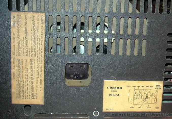 Cossor 463AC s/n A140018 veneered wood case with sloping front. Original cost £14 6s 3d plus purchase tax. OM10(ECH35) OM6 OM4(6Q7GT) 6V6 6X5. Long/medium/short wavebands working, UK1947 (I have circuit diagram)