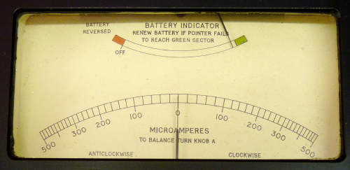 The knob A actuates the wiper of a 4 turn variable potentiometer and through a reduction gear drives the scale (0 to 115) which can be seen through the circular window. The plate marked Z covers the mechanical adjuster for the main meter 500-0-500 mA movement.