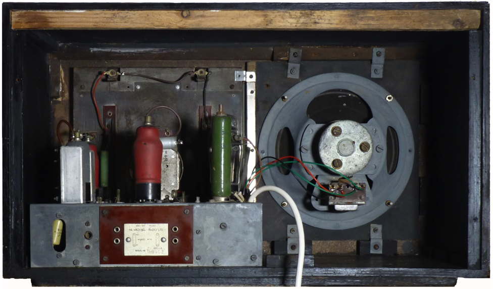 McMichael Model 471U veneered wood case table top valve radio. Five-valve (including rectifier), four-wave-band super heterodyne receiver. AC/DC mains operated 200/250Volts. Models 481U, 491U and 476C are electrically similar. Valve line up: CCH35, EF39, EBC33, CL33 and CY3I. The four wavebands provided are Long, Medium and two Short wavebands. One of them being a “Trawler” band (50-170m) and the other covers, 13.5-5Om. The scale panel includes a waveband indicator, and facilities are provided for the connection of an external speaker. First released in December 1946 when it cost �18 10.3, plus �5 19s 7d purchase tax.