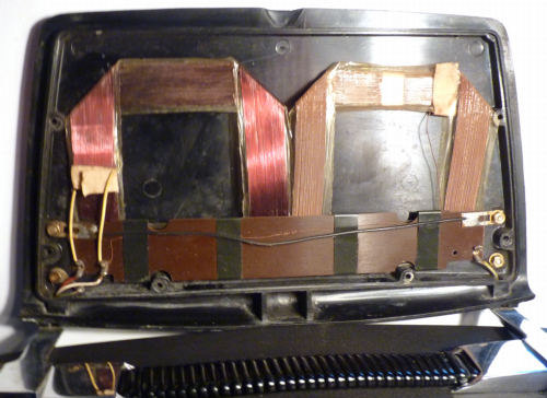 Cleaning involved dismantling the case, buffing the plastic and chrome parts with 'T Cut' and applying black leather shoe reviver to the crackle finish on the metal portion of the case. I soldered wire extensions to the broken clips on the front cover of the frame aerials to keep it properly in position. The logo was copied from the instruction leaflet, cleaned up, coloured and printed at an appropriate size on plain paper which I glued in place and coated with clear polystyrene adhesive.