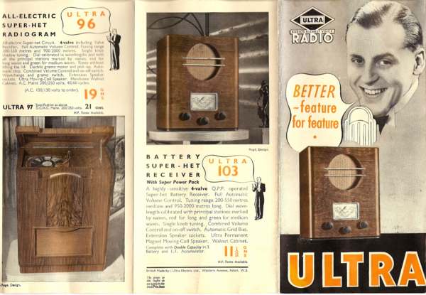 Reproduced below is part of a 1936 leaflet showing some of the radios and radiograms produced that year. The Ultra 26 (centre top) is electrically almost the same as the model 25 described above. The tuning indicator and the pick-up matching transformer have been omitted but the chassis layout and the valves used are the same.