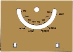 I cleaned up and polished the cabinet of the first one and treated the wood worm holes. The dial had been painted black thus obscuring the original markings below the curved indicator slot. When I tried removing the black paint some of the original cream paint came away as well so I scanned the dial plate (which is 4.375 inches by 3 inches) and printed out another on photo paper and glued it to the original dial plate see below: